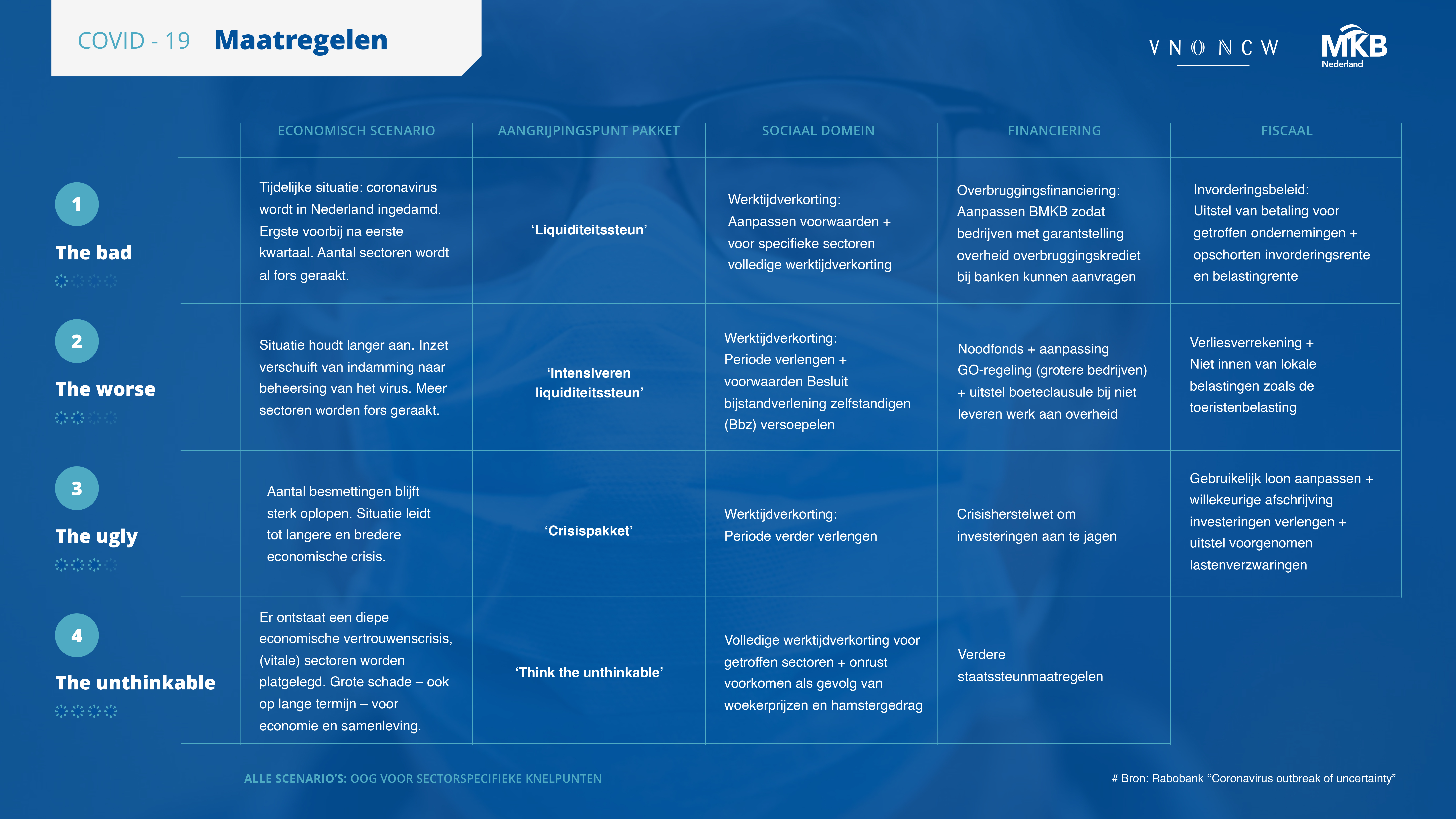 Omdat de nood nu hard oploopt bij veel ondernemers hebben VNO-NCW en MKB-Nederland voor vier scenario’s uitgewerkt met wat er moet gebeuren om te zorgen dat de economische gevolgen van het coronavirus beheersbaar blijven. De scenario’s lopen uiteen van een tijdelijke situatie tot het ondenkbare met langdurige en grootschalige uitval in grote delen van de economie.