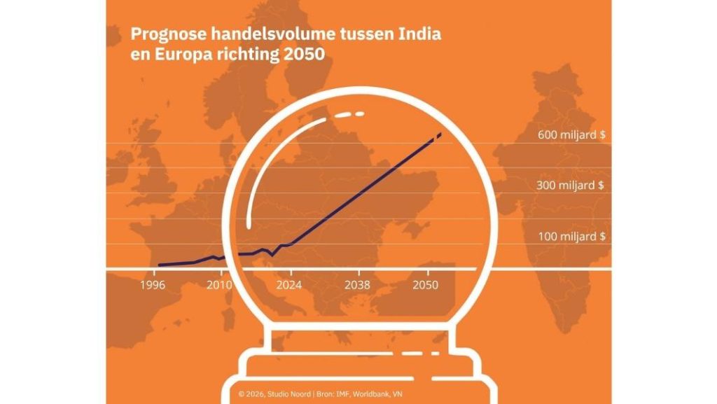 Tot slot toont de vierde infographic de verwachting voor de toekomst. Het handelsvolume tussen India en Europa zal naar verwachting sterk blijven groeien richting 2050. Dit benadrukt het strategische belang van India voor Nederlandse bedrijven, zeker in het licht van het nieuwe handelsakkoord.