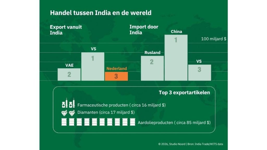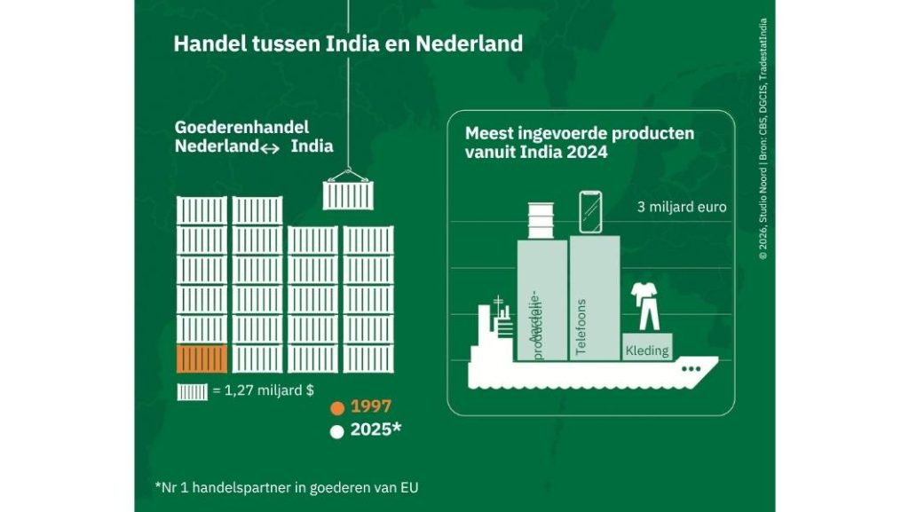 Vervolgens wordt ingezoomd op de handelsrelatie tussen Nederland en India. De goederenhandel is de afgelopen decennia sterk toegenomen, met een groeiende stroom aan import en export. Productgroepen zoals chemische producten, machines en textiel laten zien hoe breed de economische verwevenheid inmiddels is.