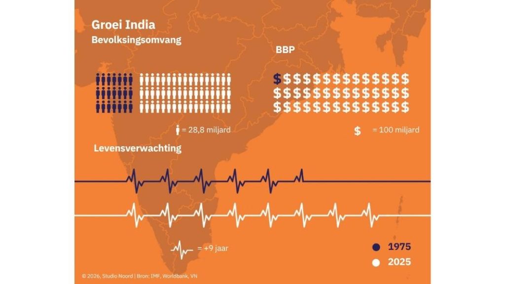 De eerste infographic laat zien hoe snel India zich ontwikkelt. Bevolkingsgroei, economische groei en stijgende levensverwachting illustreren de schaal en het tempo waarmee het land verandert. Dit maakt India tot een steeds belangrijkere speler in de wereldeconomie.