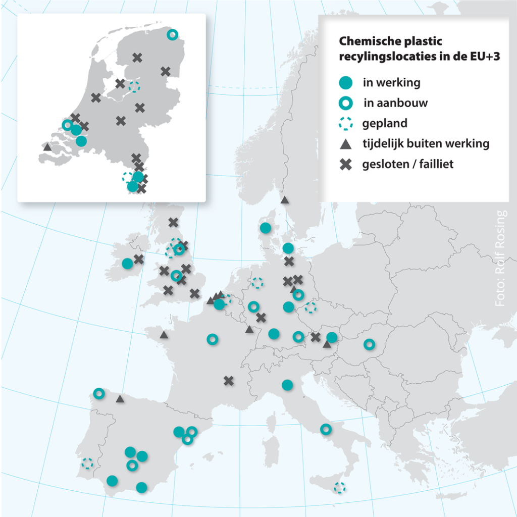 Die terugtrekking van de petrochemische sector beïnvloedt weer de plastic recycling in Nederland. Ook dat is te merken. Nederland is Europees koploper in het verliezen van plastic recycling faciliteiten (zie tabel van Plastics Recyclers Europe). Er is te weinig vraag naar hun product, want plastic recyclaat is duurder dan plastic gemaakt van aardolie. Die prijs van fossiel plastic gaat voorlopig niet omhoog, want buiten Europa worden nog volop plastic fabrieken bijgebouwd. Zo is de Nederlandse plastic industrie, inclusief circulaire innovaties, in een neerwaartse spiraal beland.